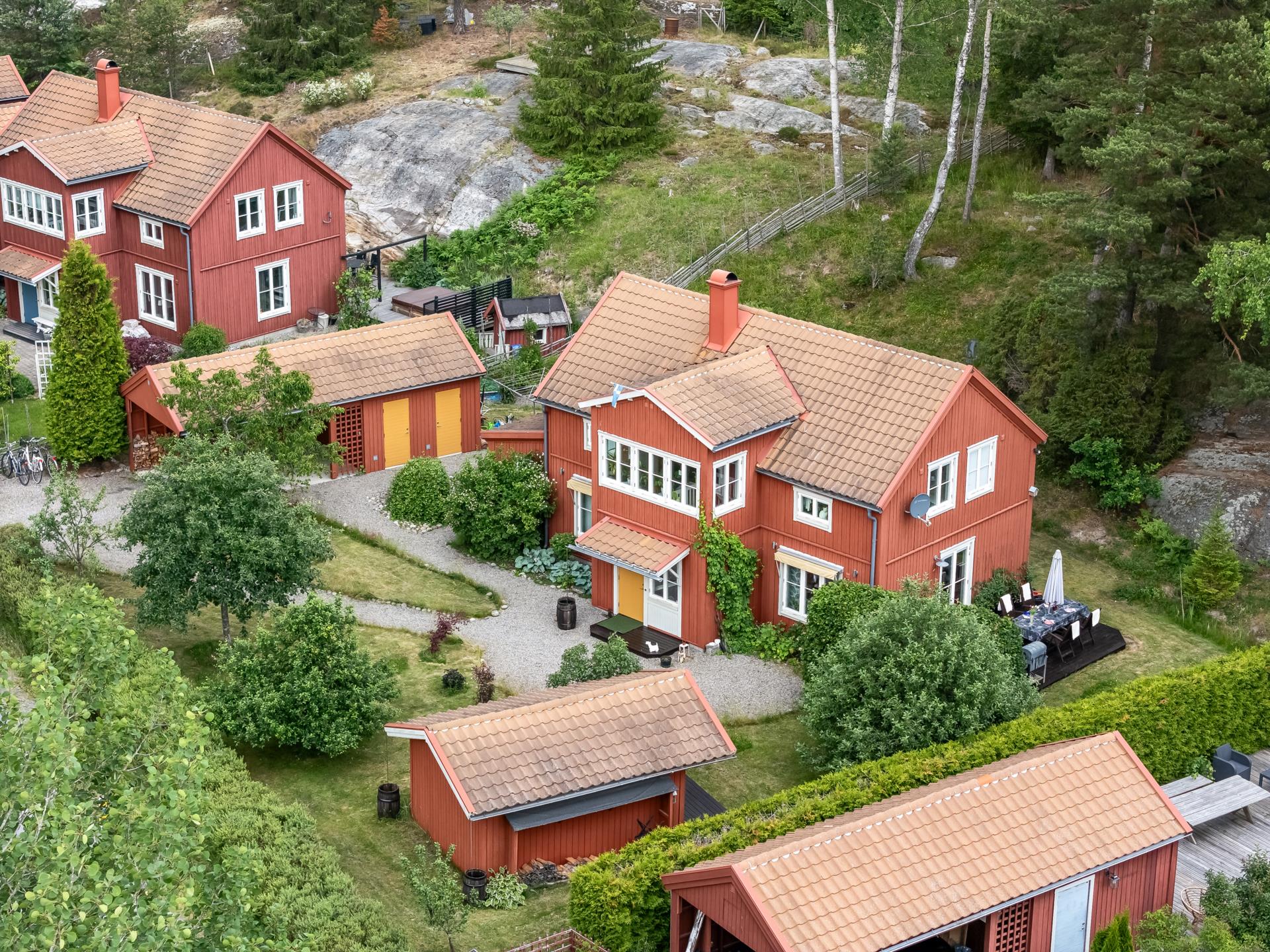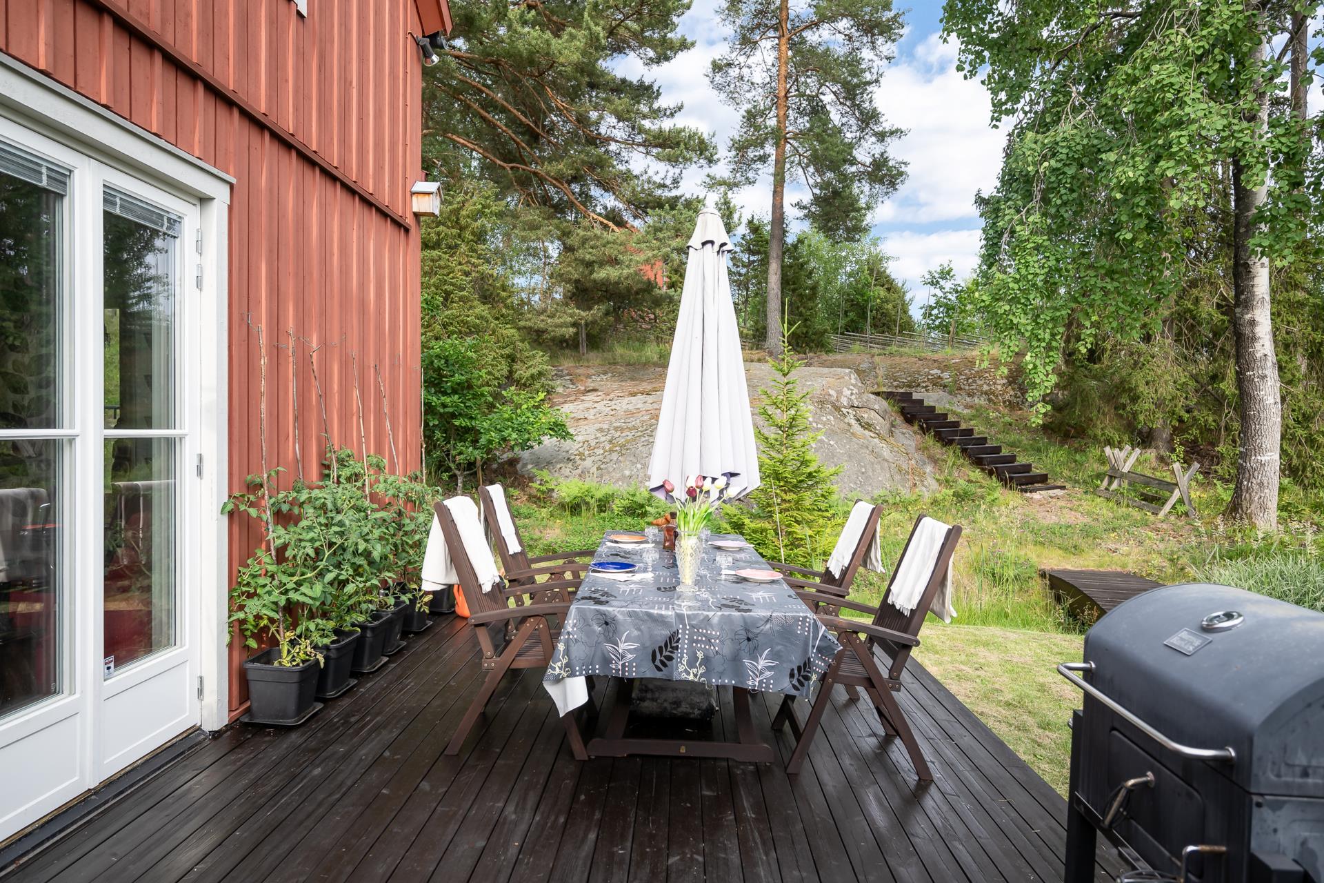 Den uppvuxna och omsorgsfullt skötta tomten skapar flera privata oaser där du kan njuta av lugnet, tystnaden och långa sommardagar i en harmonisk miljö.