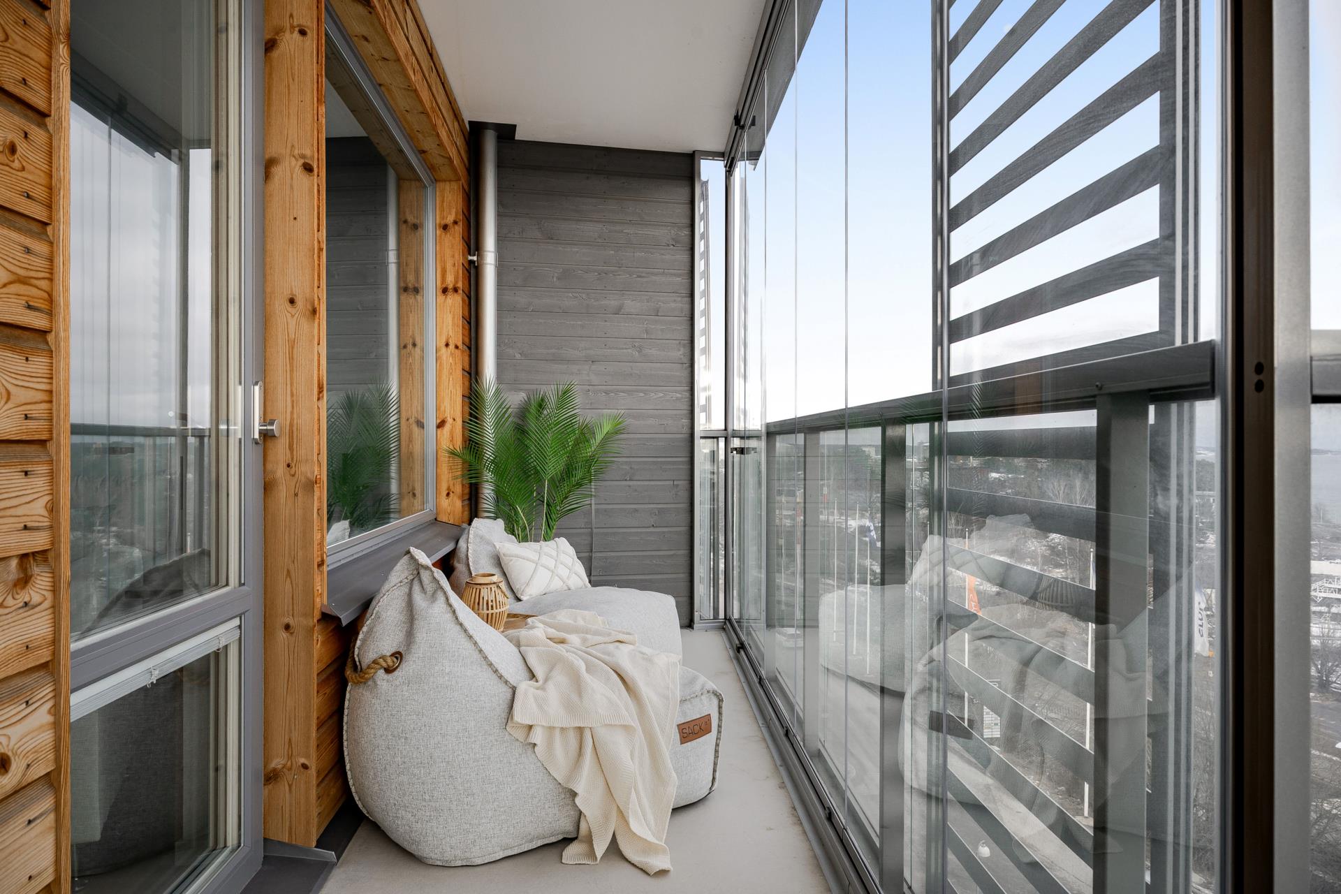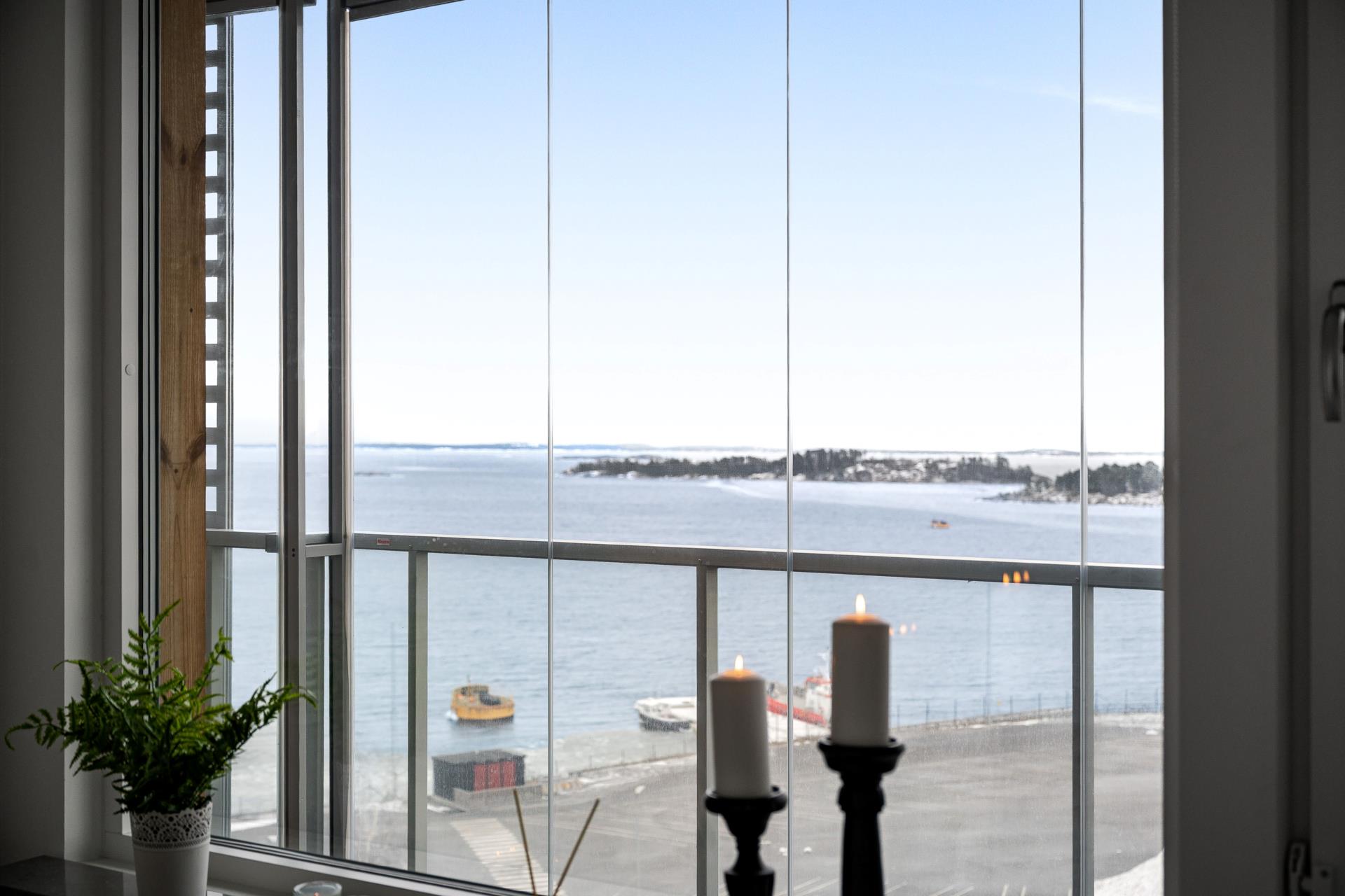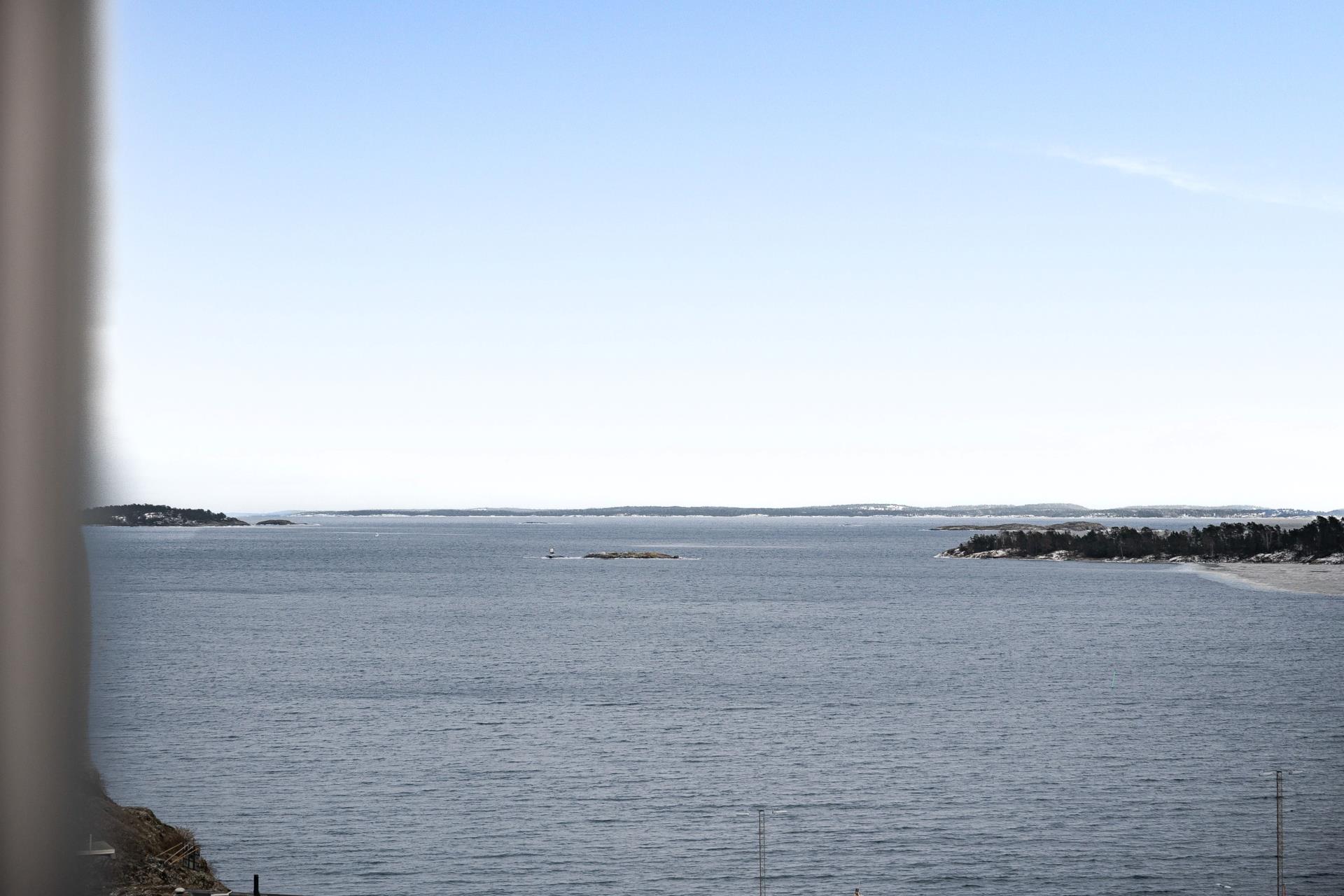 Redan när Ni kliver in i denna trivsamma bostad möts ni av den öppna planlösningen, det härliga ljusinsläppet från de stora fönsterpartier och inte minst - den fantastiska utsikten ut mot havshorisonten, kobbar och skär. Ju närmre balkongen man kommer landar tanken att man befinner sig nästan precis vid havsbrynet, men samtidigt så centralt att du kan gå till allt du behöver. Här kan ni avnjuta både morgonkaffet och lunchen i solens strålar fram till ca kl 13-14.