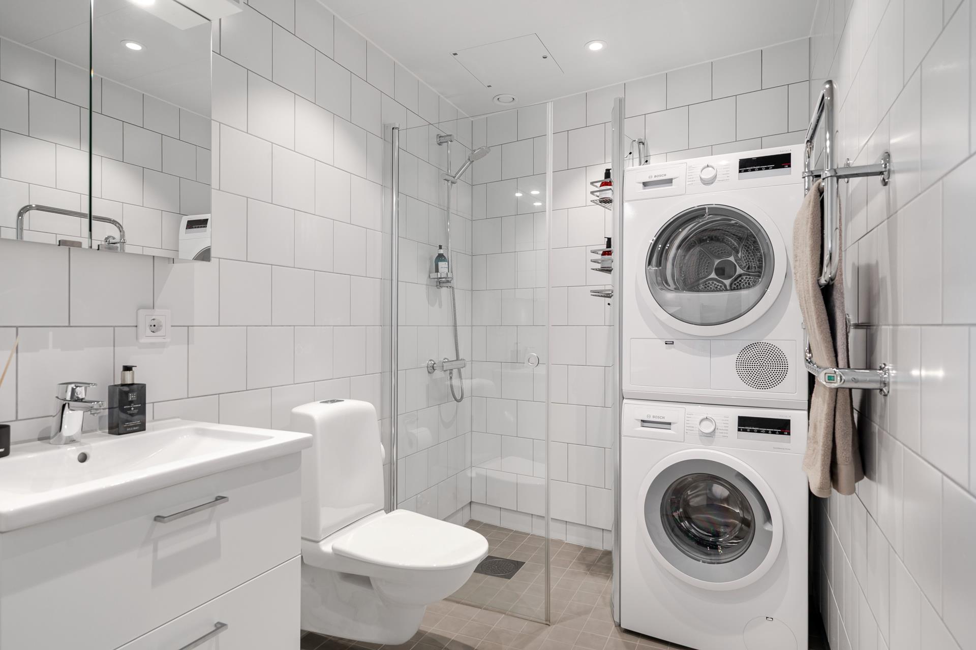 Hall med klinkergolv i en beige ton, liknande de mindre klinkerplattorna som ligger i det stora badrummet direkt till höger från hallen, här med spotlight och vitt kakel på väggarna. WC, kommod, badrumsskåp, dusch med vikdörrar, handdukstork samt egen tvättpelare.