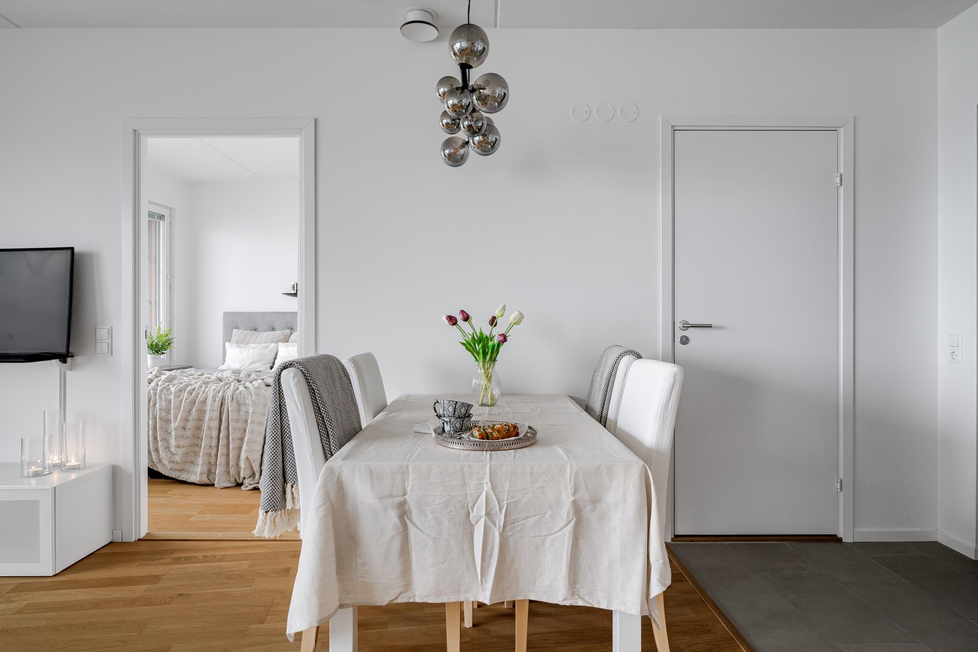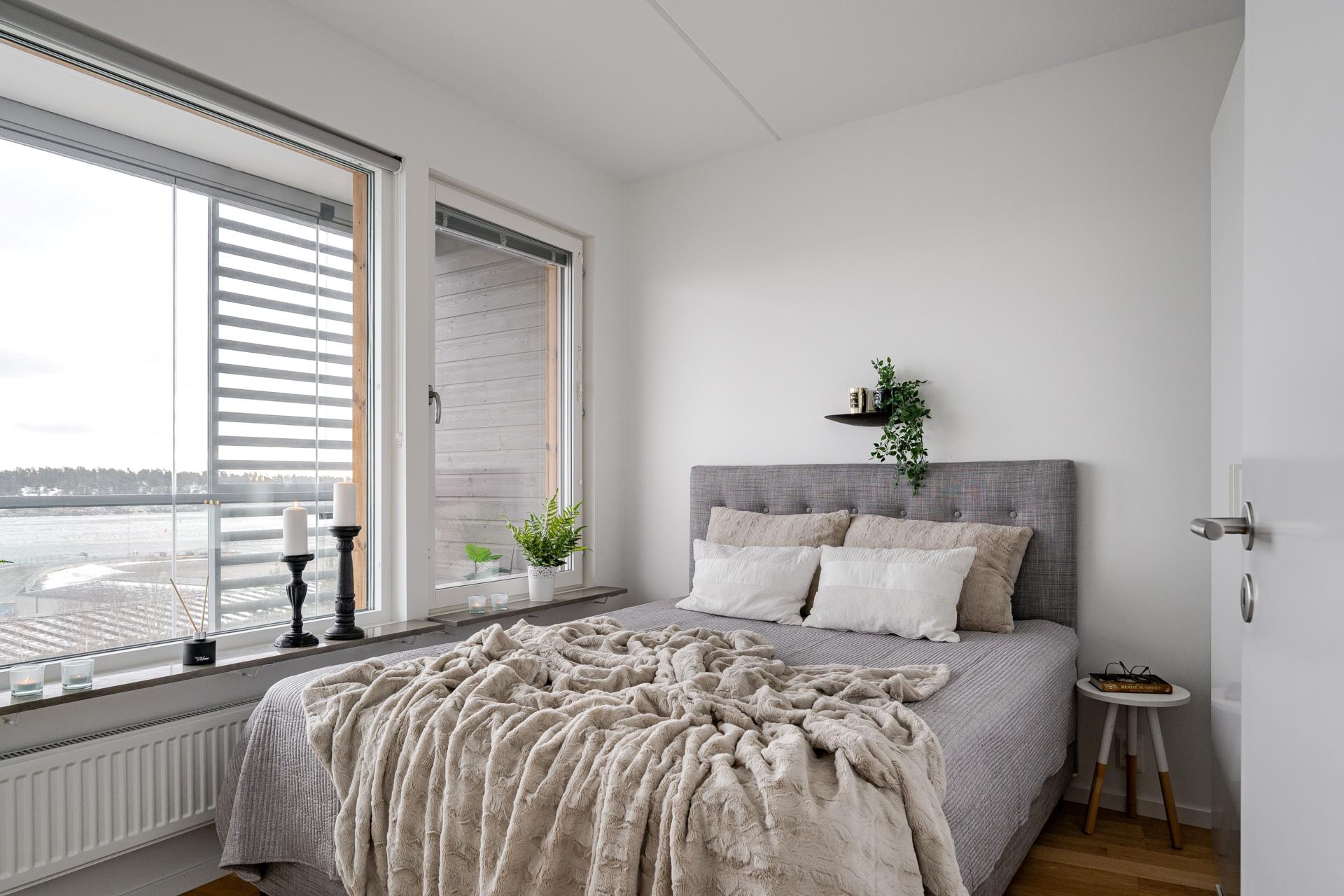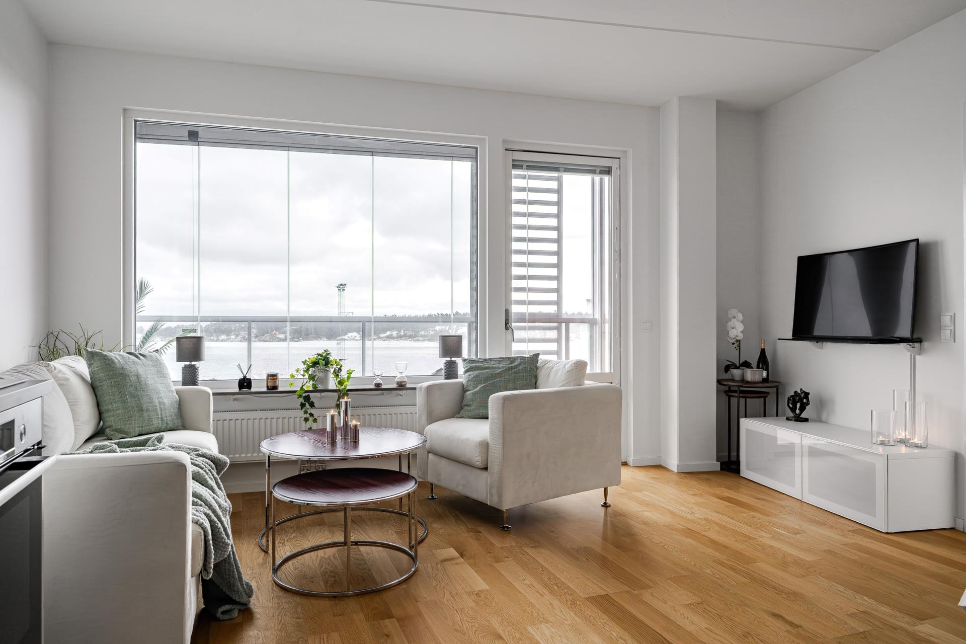 Vakna upp till de glittrande vågorna och havsbrisen utanför fönstret. Samma fina ljusa parkettgolv som flyter med i hela lägenheten, ljusa ytskikt och flertalet garderober.