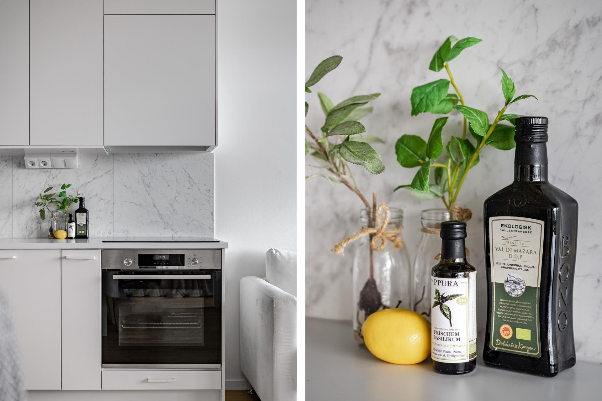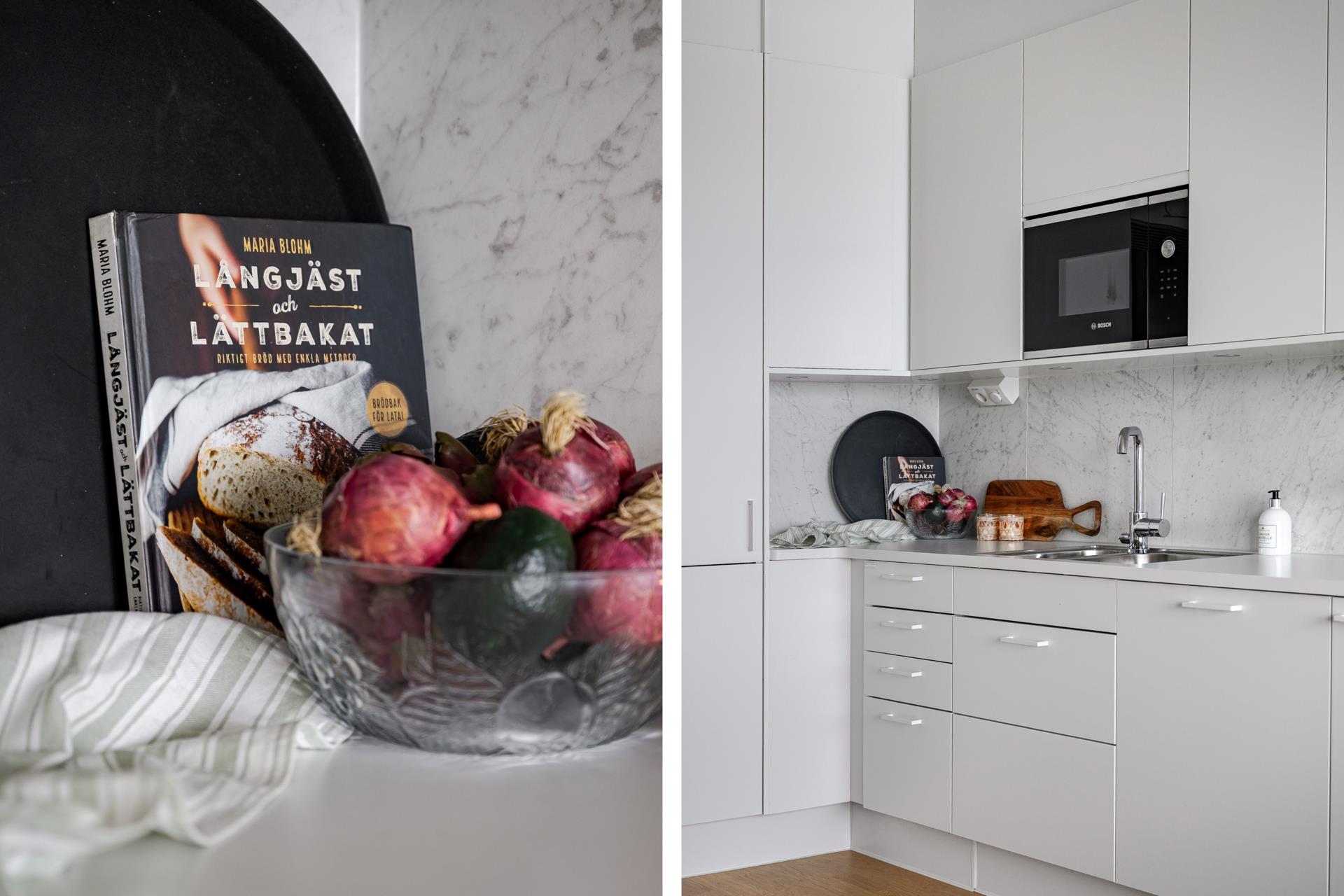 Sobert kök med infällda spotlights ovan arbetsytorna och marmorliknande laminatbänkskiva med nedsänkt ho och spishäll, vilken även matchar skivorna på väggen. Gott om förvaring, städskåp samt integrerad diskmaskin och fläkt. Delad kyl frys samt inbyggd ugn och mikro.