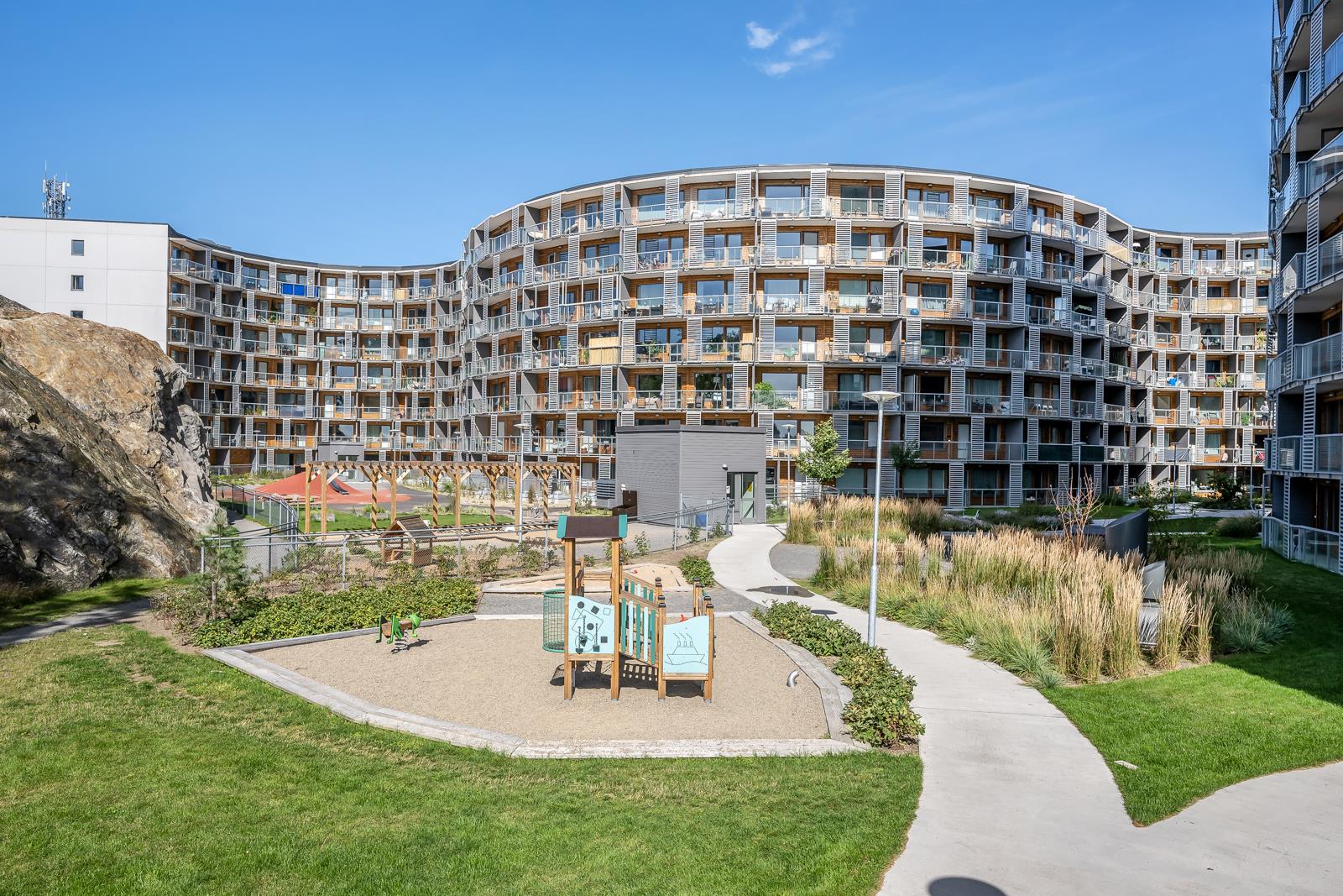 Fin grön innergård med lekplats, sittplatser och boulebana.