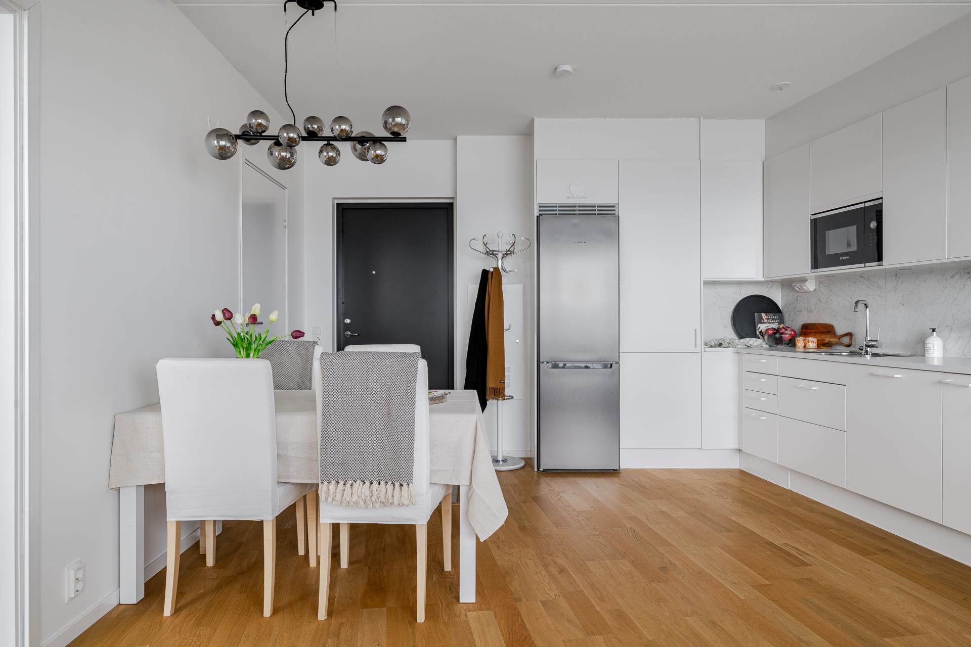 På entréplanet finns även en välutrustad tvättstuga, cykelförråd, gym och bastu.